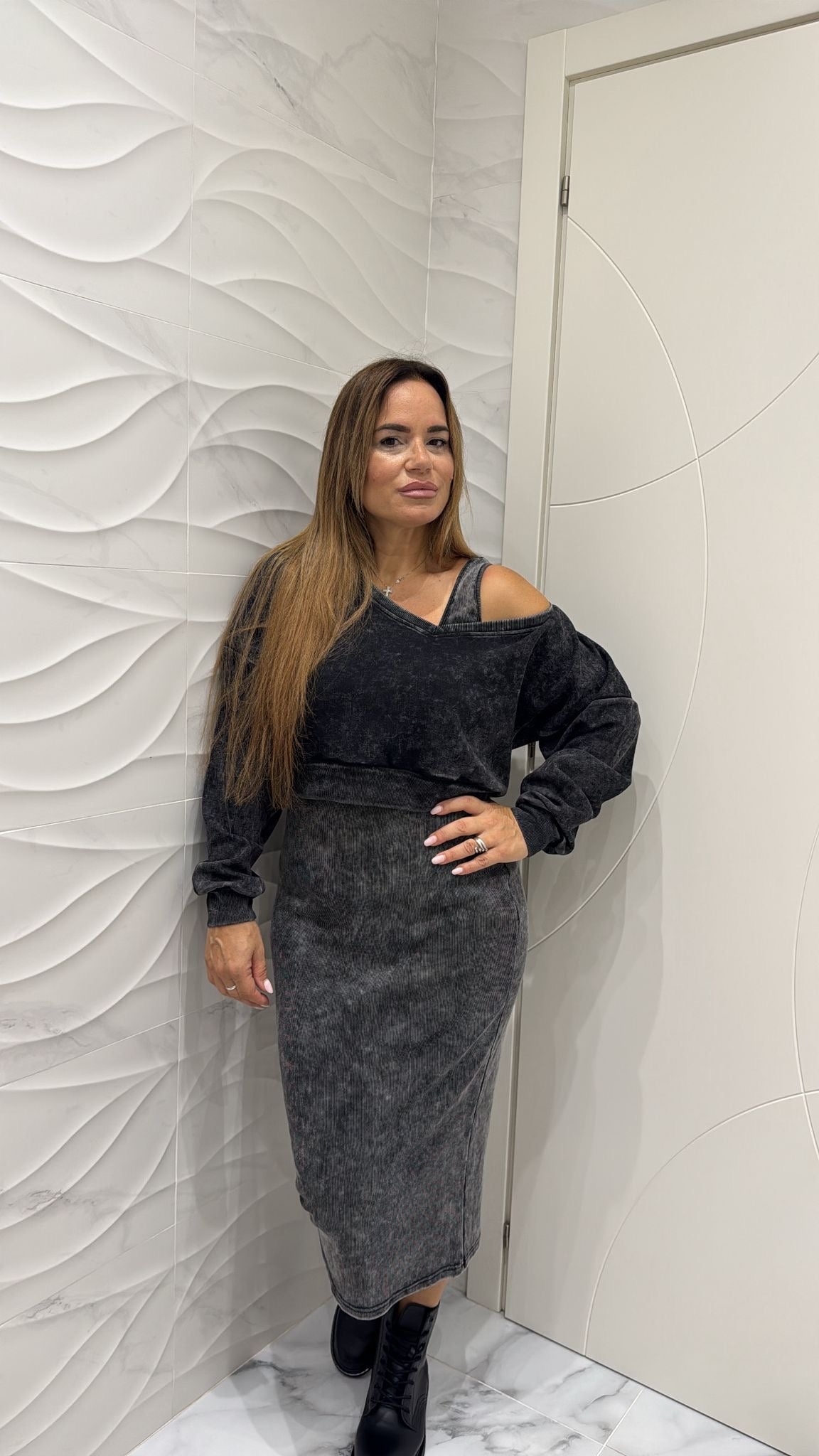 Coordinato composto da abito a costine giro manica scollo rotondo.Felpa crop scollo a V con elastico.